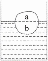 2. 小华想用天平和一杯浓盐水(已知浓盐水的密度为$ρ_{0}$)及其他辅助器材测量密度均匀的萝卜的密度:①用天平测出萝卜的质量为$m_{1}$。②把萝卜轻轻放入浓盐水中漂浮(如图),用记号笔记下液面在萝卜上的位置。③取出萝卜擦干,用刀沿记号将萝卜切成a、b两块,测出b块的质量为$m_{2}$。则萝卜密度的表达式为$ρ=$