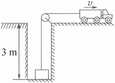 3. 如图所示,一重2000N的物体被遗失在井中,现通过汽车将其提升出来。已知井底到井口的高度为3m,物体从井底到井口上升用时10s,汽车质量为1.2t,轮胎与地面的总接触面积为$800cm^2,$若四个车轮受力均匀,汽车前进过程中自身受到水平地面对它的摩擦力为车重的0.1倍(忽略绳的重力、绳与滑轮之间的摩擦,空气阻力不计)。