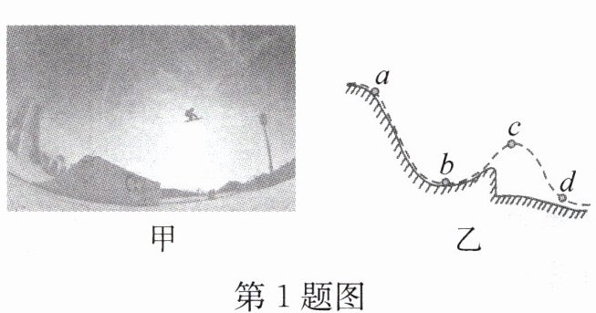 1. 图甲是北京冬奥会中翻跃大跳台的情景。运动员不借助滑雪杖,只踩着雪板从高处滑行而下,通过起跳台起跳,完成各种空翻、转体等技术动作后落地。图乙中的虚线是比赛过程中运动员的轨迹。不计空气阻力,下列说法正确的是(