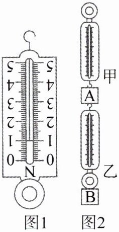 2. 在实验时,小明将一个正常的铁质外壳测力计的挂钩挂在铁架台上,静止时有如图1所示的示数。接着,他把这个测力计像如图2中乙那样,上、下各挂一个50g的钩码,并挂到甲测力计下,则甲、乙两测力计的示数分别是______