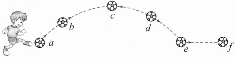 1. 小明在体育课上进行射门练习,如图所示是他向空中踢出足球到足球落地而停止运动的场景,箭头表示足球的运动方向,当足球运动到最高点c时,若所有外力作用都消失,则足球将(