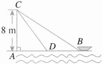 18. 如图,在离水面高度为$8m$的岸上,有人用绳子拉船靠岸。开始时船离岸边的距离$AB为12m$,当此人把绳子收紧后,船移动到距离岸边$6m的D$处,求在这个过程中此人将绳子收紧了多少米?(结果保留根号)
