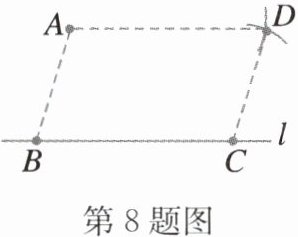 8. 如图,点$A是直线l$外一点,在$l上取两点B$,$C$,分别以$A$,$C$为圆心,$BC$,$AB$的长为半径画弧,两弧交于点$D$,分别连接$AB$,$AD$,$CD$,则四边形$ABCD$一定是(
