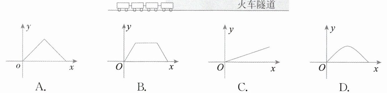 8. 如图,火车匀速通过隧道(隧道长大于火车长)时,火车进入隧道的时间 $ x $ 与火车在隧道内的长度 $ y $ 之间的关系用图象描述大致是 (