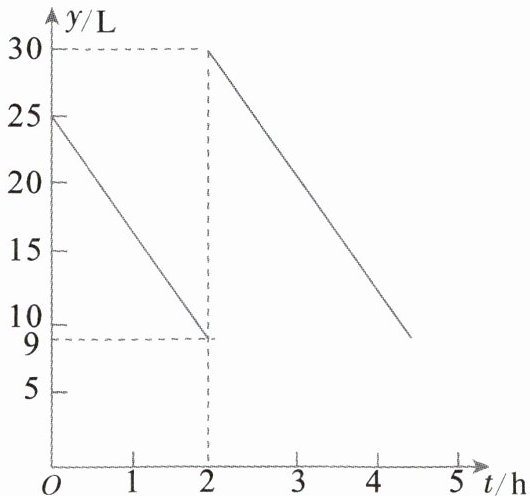 C. 加油后,设 $ y = mt + n $,将 $ (2,30) $、$ t=0 $ 时加油前耗油量 $ 25 - 9 = 16 \, \text{L} $,时间 2h,