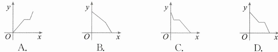 7. 为了建设社会主义新农村,某市积极推进“行政村通畅工程”.张村和王村之间的道路需要进行改造,施工队在工作了一段时间后,因暴雨被迫停工几天,不过施工队随后加快了施工进度,按时完成了两村之间的道路改造.下面能反映该工程尚未改造的道路里程$y(km)与时间x(d)$的函数关系的大致图象是(