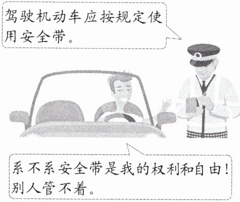 ①漫画中的开车男子没有认识到任何权利都是有范围的。公民在行使自由和权利的时候,不得损害国家的、社会的、集体的利益和其他公民的合法的自由和权利。②漫画中的开车男子没有依照法定程序行使权利。开车上路应该遵守交通规则,自觉系好安全带。③自由不是为所欲为,它是有限制的、相对的。法治标定了自由的界限,自由的实现不能触碰法律的红线。
