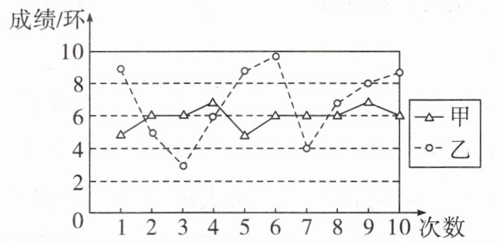 10. 甲、乙两人在相同的条件下各射击10次,将每次命中的环数绘制成如图所示的统计图. 根据统计图得出的结论正确的是 (