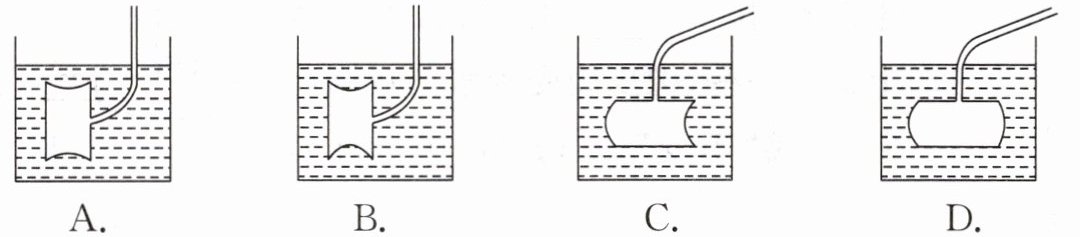 2. 如右图所示,玻璃管两端开口处蒙有绷紧程度相同的橡皮膜。将此装置放入水中,下图中能正确反映橡皮膜凹凸情况的是 (