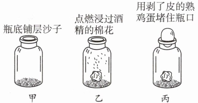 2. 如图所示,取一个瓶口直径小于鸡蛋的瓶子,在瓶底铺层沙子,点燃浸过酒精的棉花,把它放入瓶中,再用剥了皮的熟鸡蛋堵住瓶口,结果鸡蛋进到瓶子里,这是因为 (