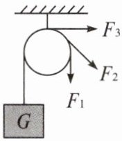2. 如图所示,用同一定滑轮沿三个不同方向,以不同速度匀速提升同一重物G,所用的拉力分别为F₁、F₂、F₃,则这三个力的大小关系是