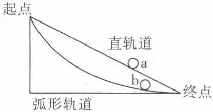 8. 如图所示是“最速降线”简化结构示意图,现将a、b两个完全相同的球同时分别从直轨道和弧形轨道的起点由静止释放,结果弧形轨道上的b球先到达终点。在a、b两球从起点到终点的过程中重力做功分别为W₁和W₂,重力做功的功率分别为P₁和P₂,则下列说法正确的是(