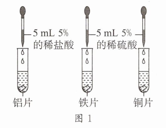 【进行实验】分别取形状、大小完全相同的三种金属片放在三支试管中,进行如图 1 操作并记录了实验现象。