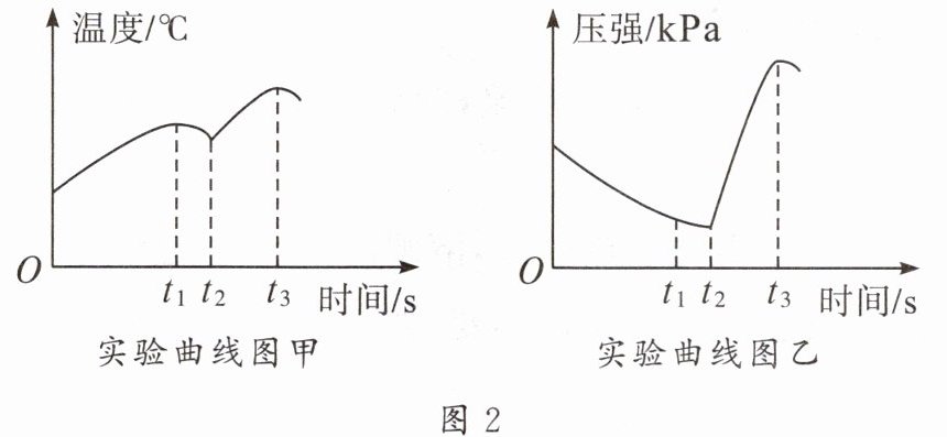 。(2)图 2 甲、乙曲线图中,O~t₁段温度升高,瓶内压强减小;t₂~t₃段温度升高,瓶内压强增大。解释产生这两个不同现象的原因。