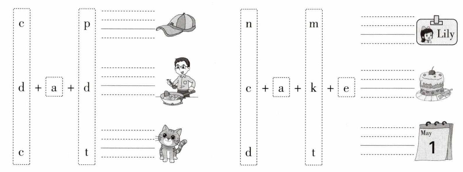 一、青青来到“欢乐配”乐园。将下面这些字母组合成与图片相符的单词,并写在四线三格中。