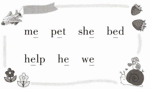 一、芳芳在练习发音。她的单词卡上写着一个 be。请将画线部分发音与 be 相同的单词写在四线三格中。