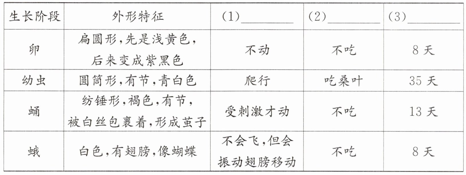 (2) 阅读观察记录表可知,在蚕的四个生长阶段中,“卵”和“蛹”不会动。 (