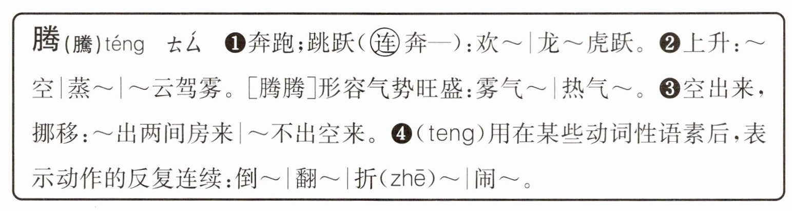 画。“腾”字在《现代汉语词典》中有多项解释(见上图),请结合语境给下列句子中的“腾”字选择恰当的意思,把序号填在括号里。1. 热气