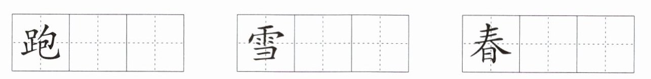 跑 雪 春 (需学生在田字格中规范书写出这三个字)
