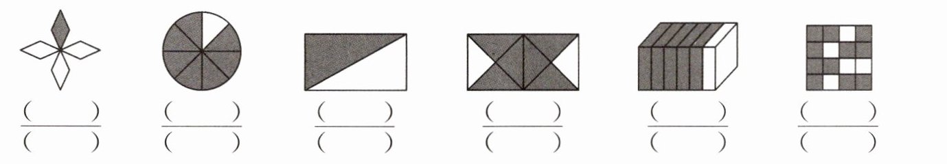 二、把下面每个图形都看作单位“1”,用分数表示各图中涂色部分的大小。