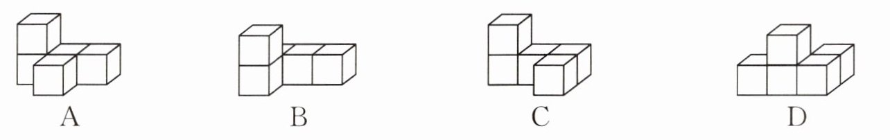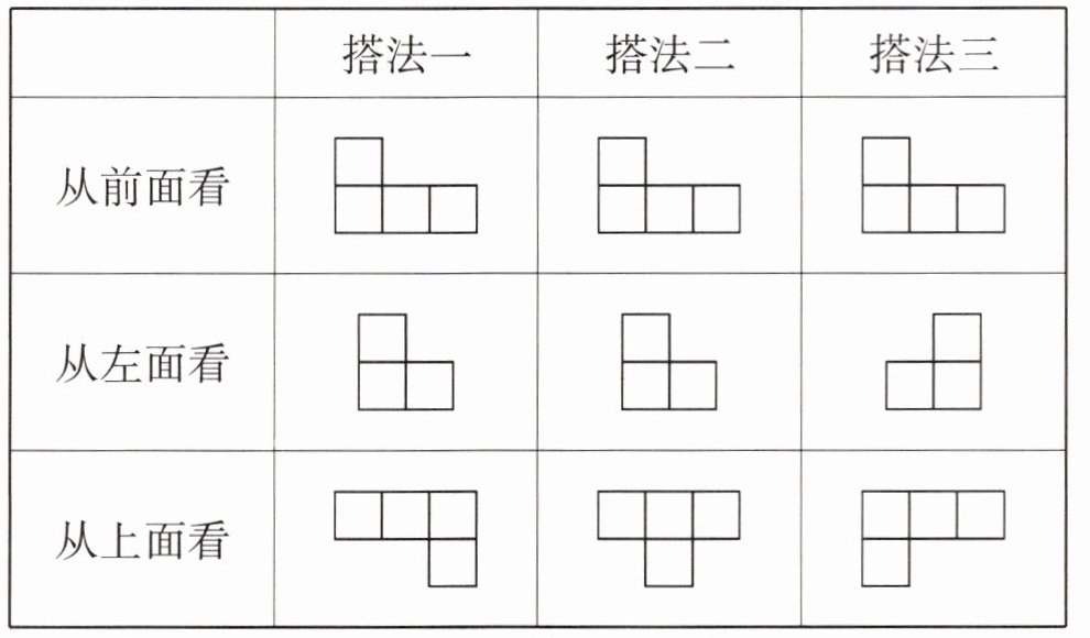 4. 用5个同样的小正方体搭3种不同的几何体,从前面、左面和上面看到的平面图形如下表,则搭法一对应的几何体是(
