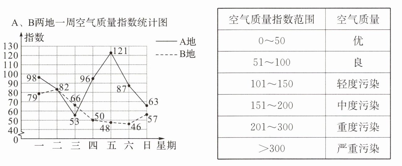 )天 B 地的空气质量要好于 A 地。(4)B 地空气质量为优的天数占这周总天数的几分之几?