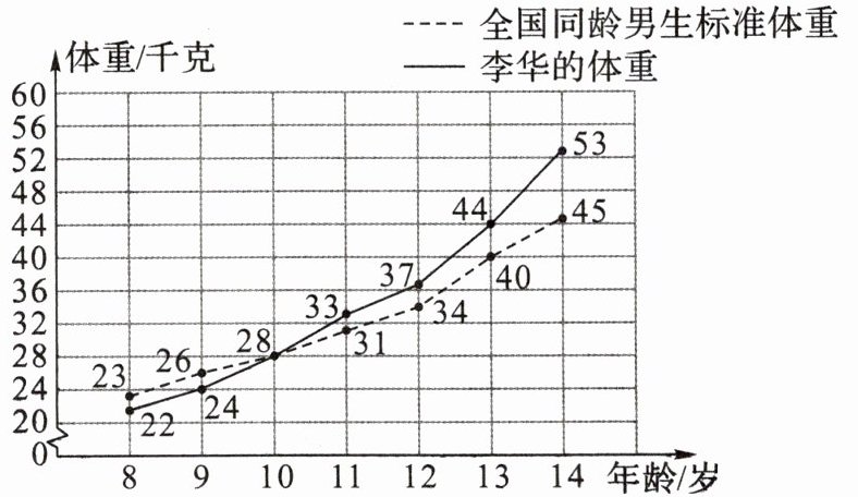 1. 李华每年生日时都测量体重,下图是他 8~14 岁生日时测量的体重与全国同龄男生标准体重的对比统计图。