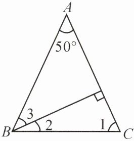如图,三角形ABC是等腰三角形,顶角是50°,求∠1=