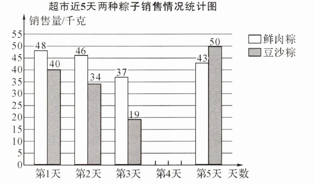 (1)根据统计表信息,补全上面的统计图(画出第 4 天的数据)。(根据统计表,第4天鲜肉粽销售50千克,豆沙粽销售42千克,在统计图中对应画出高度为50(鲜肉粽)和42(豆沙粽)的直条即可)