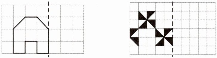 本题可根据轴对称图形的性质,通过对称点到对称轴的距离相等来画出另一半。步骤一:分析第一个图形 - 对于第一个图形(类似房子形状):先找出已知图形各顶点关于对称轴的对称点。例如,图形最上面的顶点,测量其到对称轴的水平距离,然后在对称轴另一侧相同距离处确定对称点。对于图形的其他顶点(如房子的轮廓顶点、门的顶点等),都按照同样的方法确定对称点。最后,依次连接这些对称点,就可以画出该轴对称图形的另一半。步骤二:分析第二个图形 对于第二个图形(由多个三角形组成的图案):同样先确定每个三角形顶点关于对称轴的对称点。由于这些三角形分布较为分散,需要仔细测量每个顶点到对称轴的距离(水平或垂直距离,根据顶点位置而定)。比如左上角三角形的顶点,测量其到对称轴的水平距离,在对称轴另一侧确定对称点;对于一些垂直方向有位置的顶点,测量其垂直距离确定对称点。确定所有顶点的对称点后,连接这些对称点,完成该轴对称图形另一半的绘制。综上,按照上述方法即可画出两个轴对称图形的另一半(由于是画图题,此处无法直接呈现图形,你可根据上述步骤自行绘制)。