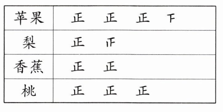 本题可根据“正”字计数法分别计算出喜欢每种水果的人数,再据此进行求解。