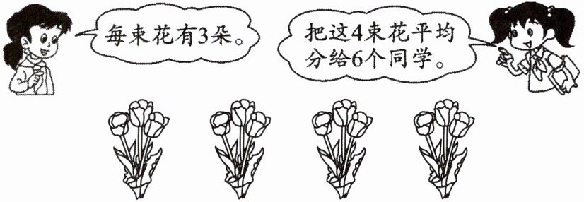 【解析】:首先计算花的总数,每束花有$3$朵,一共有$4$束,那么花的总数为$3×4 = 12$朵。然后把$12$朵花平均分给$6$个同学,求每个同学分几朵,用除法计算,即$12÷6 = 2$朵。