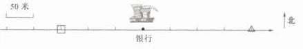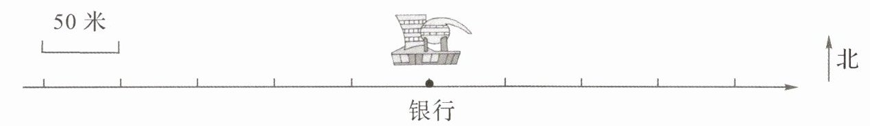 在银行东面 200 米的地方有一家超市,请用“△”标出来;在银行西面 150 米的地方还有一家书店,请用“□”标出来。
