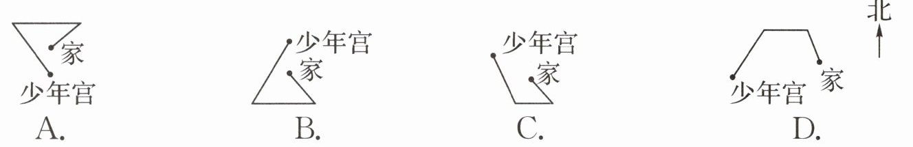 小伟从家出发,先向东南方向走,再转向西走,最后转向东北方向走到少年宫。下面几条路线中,小伟走的路线是(