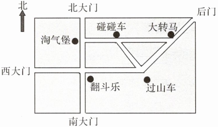 2. 小李从后门进,先后玩了大转马、碰碰车、过山车和翻斗乐,然后从西大门出。请你用方位说说小李的游玩路线。
