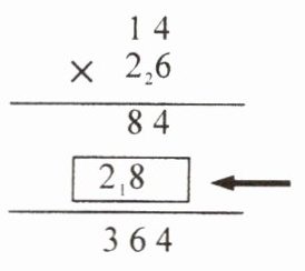 4. 超市运来 26 箱苹果,每箱 14 千克,右边算式算出了这些苹果的总质量。竖式中箭头所指的这一步结果表示的是(