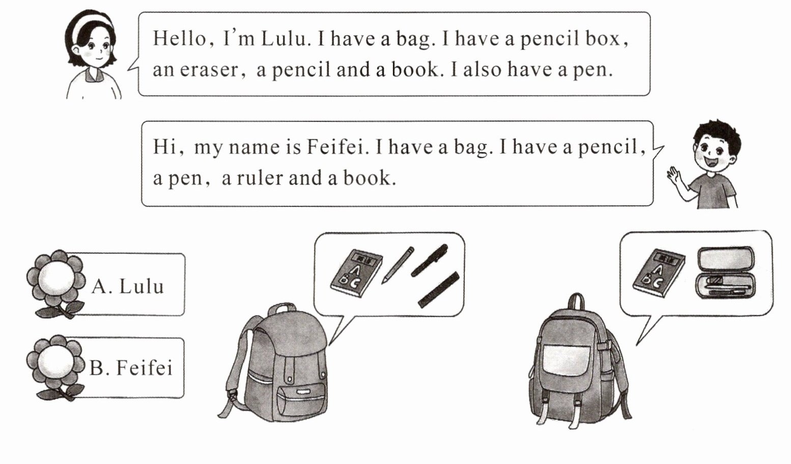 二、璐璐和飞飞的书包丢了,他们想去学校的失物招领处找一找。请阅读他们的描述,帮助他们找到自己的书包。