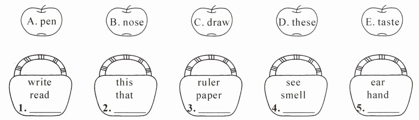 二、选出同类的单词,将序号写入对应的篮子里。