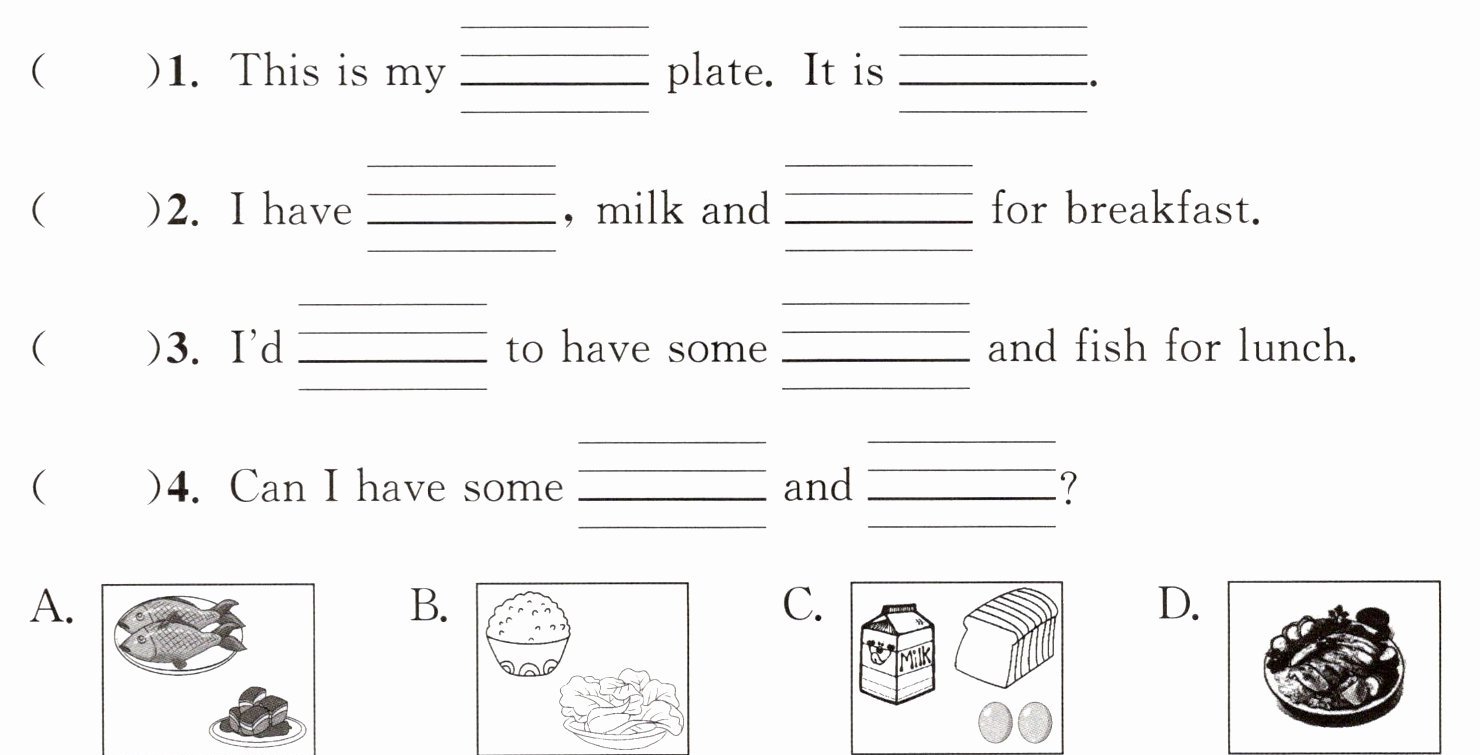 三、读句子,选图片,并选出与图文相符的单词写在四线格上。