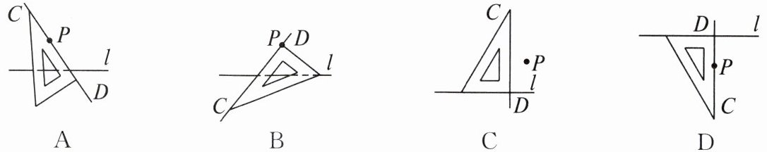 2. 下列各图中,过直线l外一点P画l的垂线CD,用三角尺操作正确的是(