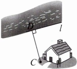 1. 如图,某单位要在河岸l上建一个水泵房引水到C处,他们的做法是:过点C作$CD⊥l$于点D,将水泵房建在了