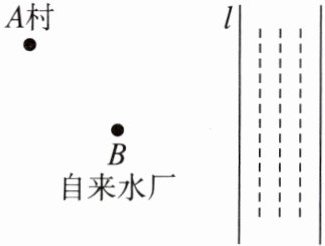 2. 如图,在河岸l的同侧有一村庄A和自来水厂B. 现要在河岸l上建一抽水站D,将河中的水输送到自来水厂后,再送往A村,问抽水站D应建在何处,才能使铺设的水管最短?在图中画出来.
