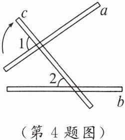 4. 如图,将木条 a,b 与 c 钉在一起,$∠1= 85^{\circ },∠2= 50^{\circ }$,要使木条 a 与 b 平行,木条 a 旋转的度数至少是(