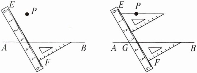 2. 如图,已知直线 AB 外一点 P,过点 P 画直线 CD,使$CD// AB$,借助三角板有如下操作:①固定直尺 EF,并沿 EF 方向移动三角尺,使斜边经过点 P;②用三角尺的斜边靠上直线 AB;③沿三角尺的斜边画直线 CD;④用三角形的一条直角边紧靠直尺 EF.其正确操作顺序是(