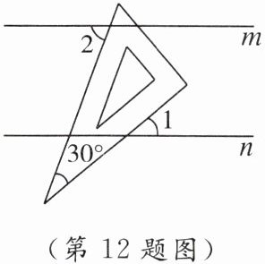 12. 如图,直线$m// n$,一块含有$30^{\circ }$的直角三角板按如图所示放置.若$∠1= 40^{\circ }$,则$∠2$的度数为(