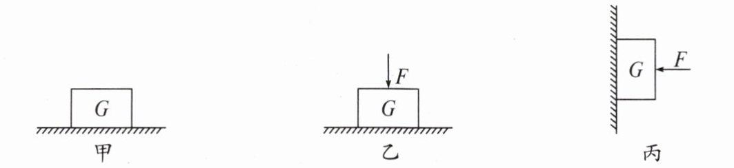 4. 在图甲、乙、丙中,物体的重力均为$G$,且均保持静止状态。则物体对各个承受面压力的大小分别为