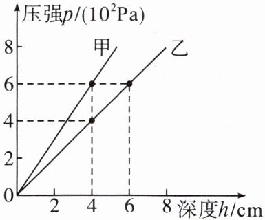 7. 小军同学研究液体压强时,绘制的甲、乙两种液体的压强与深度的关系图像如图所示。由图像知: