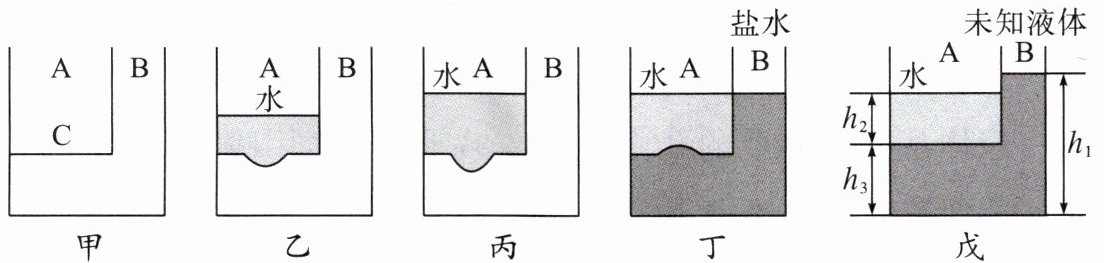 越大,液体压强越大。(3)小明还利用薄壁实验箱测量出某未知液体的密度,如图戊所示,在A箱中加入水,在B箱中加入某未知液体,使橡皮膜变平,用刻度尺测得此时$h_1= 22cm,h_2= 9cm,h_3= 12cm,$则未知液体的密度为