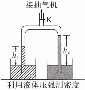 7. 聪聪利用如图所示装置测量液体的密度,将两端开口、底部带有阀门K的三通U形玻璃管倒置在两个容器中,左侧容器盛密度$(ρ_{0})$已知的液体,右侧容器盛有待测液体。先用抽气机抽出U形管内部分空气,再关闭阀门K。