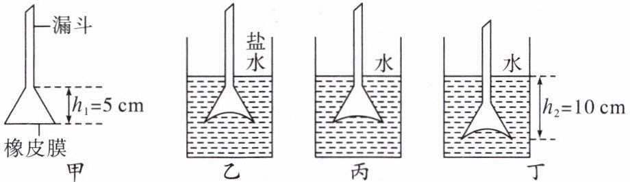 (2)图甲是套有橡皮膜的漏斗,漏斗口内深度$h_{1}$为5 cm。小龙用它进行了探究,如图乙、丙、丁所示,实验通过橡皮膜
